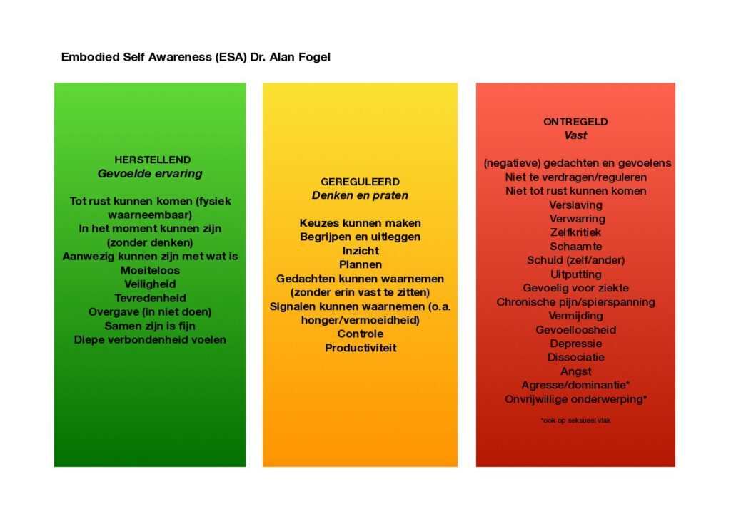 Embodied Self Awareness door Dr Alan Fogel. In zijn boek: “Restorative Embodiment and Resilience; a guide to disrupt habits, create inner peace, deepen relationships and feel greater presence” schrijft hij onder andere over drie staten van belichaamd zelfbewustzijn (Embodied Self Awareness of ESA): restorative (herstellend), modulated (gereguleerd) en dysregulated (ontregeld). Deze weerspiegelen hoe we ons voelen, zowel fysiek, mentaal als emotioneel, hoe we denken en ons gedragen. Deze drie staten heb ik in onderstaande schema kort weergegeven.