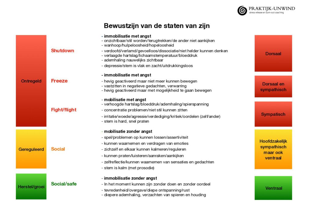 De staat van ons Autonome Zenuwstelsel (AZS), te weten veilig, gemobiliseerd, geïmmobiliseerd of een mengvorm, bepaalt door welke bril wij naar de werkelijkheid kijken; naar ons zelf, de wereld en onze relaties en bepaalt daarmee in belangrijke mate ons gedrag en hoe we ons voelen ‘The state creates the story’. Een gezond en veerkrachtig AZS beweegt gedurende de dag flexibel heen en weer tussen de verschillende staten.